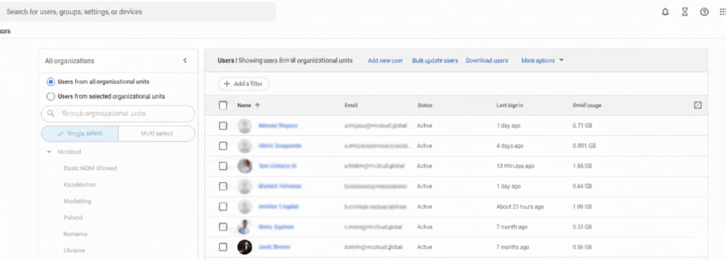 - Device management. Through the admin panel, Google Admin Console, the administrator can see which devices were used to log in and remotely block access in case of smartphone loss or employee termination.