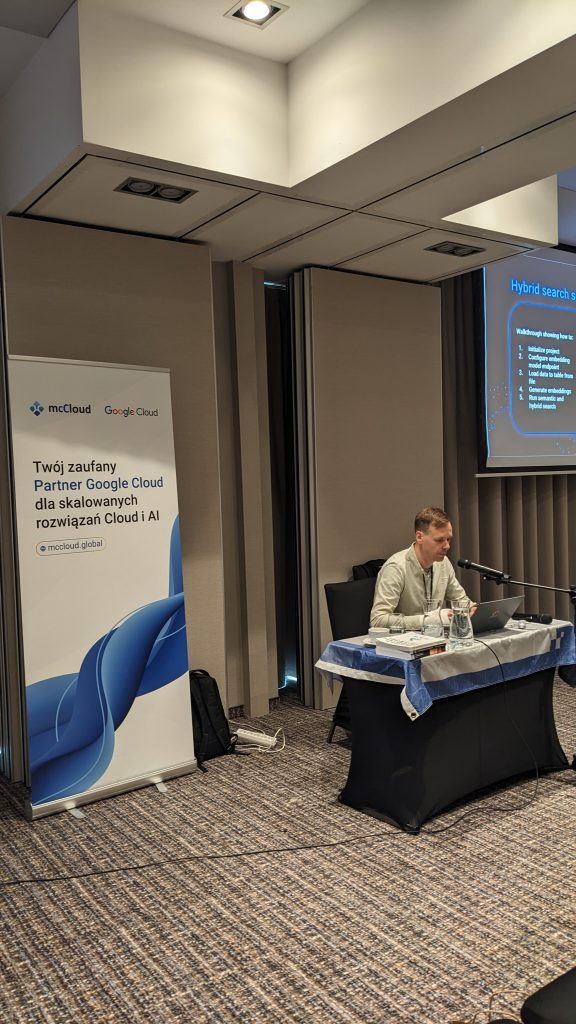 Kluczowym punktem konferencji była sesja prowadzona przez naszego Senior Google Cloud Engineera, Macieja Szatkowskiego. Jego prezentacja pt. „Agentic Product Advisor: A Hybrid Search Love Story (ADK + BigQuery)” dotyczyła praktycznej integracji generatywnej sztucznej inteligencji w architekturach korporacyjnych.
